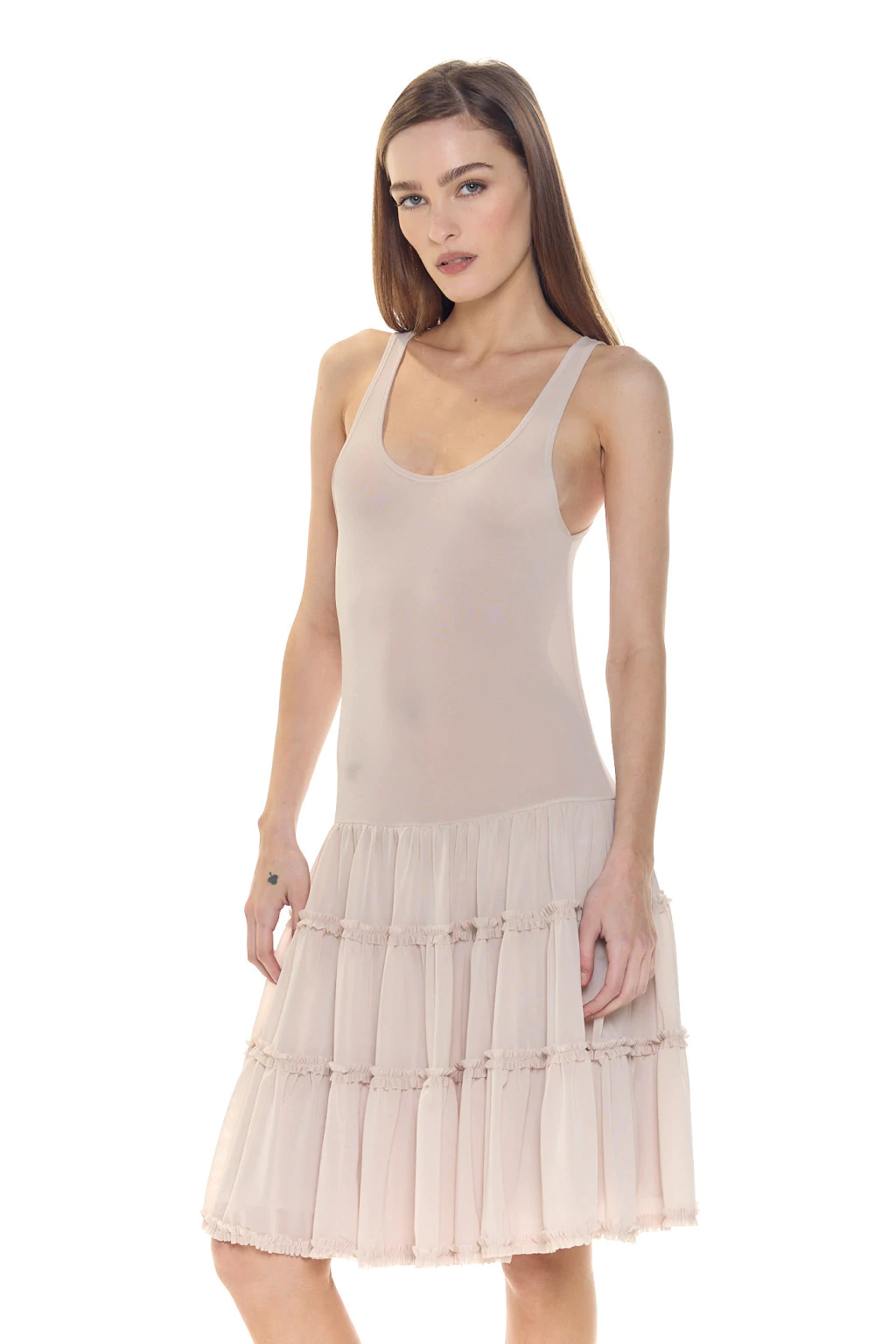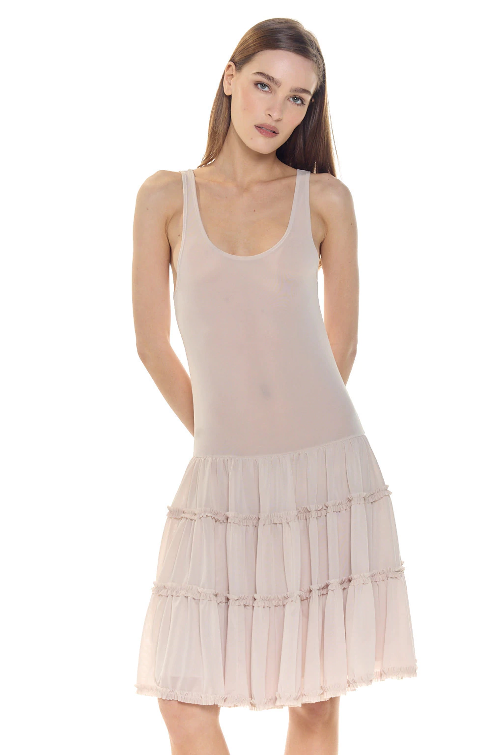 Vestido musculosa traslucido en la parte superior, con falda de volados y vuelo.